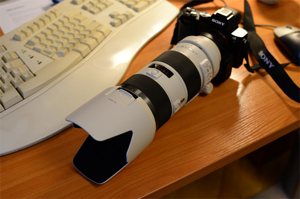 А это A7 с профессиональным объективом серии G SAL70200G. У него байонет А, так что нужно ставить через переходник. В соединении с компактным корпусом эта конструкция выглядит очень забавно.