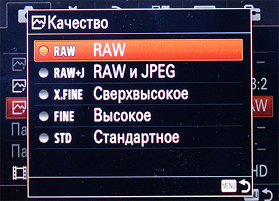 Качество - три варианта для JPEG, RAW+JPEG и RAW.