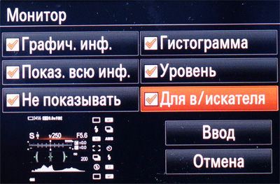 Кнопка DISP - настройка информации, выдаваемой на дисплее (отдельно - на видоискателе).