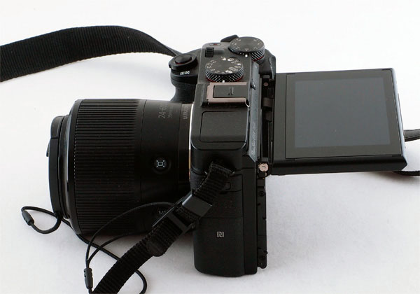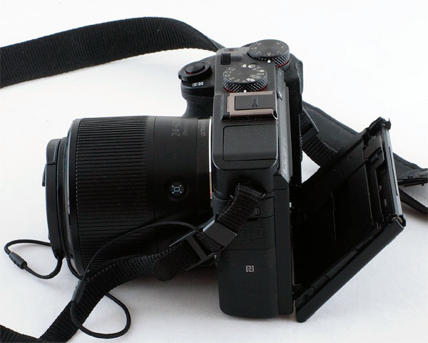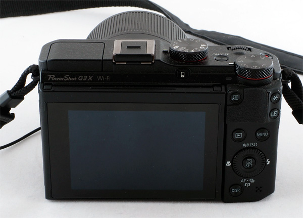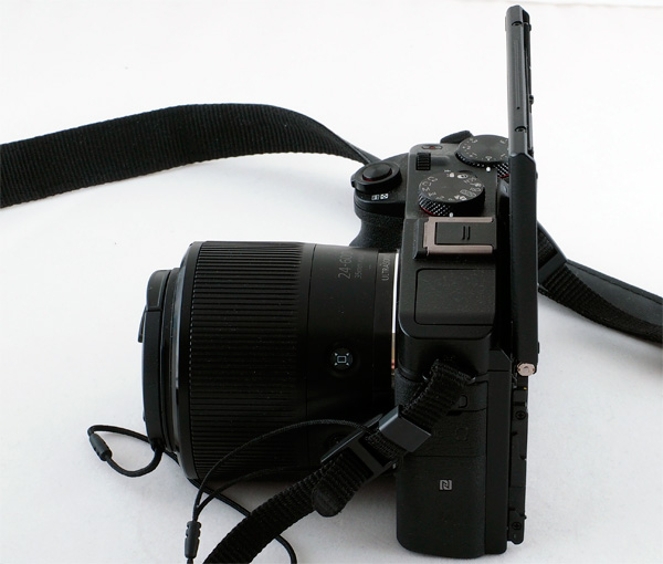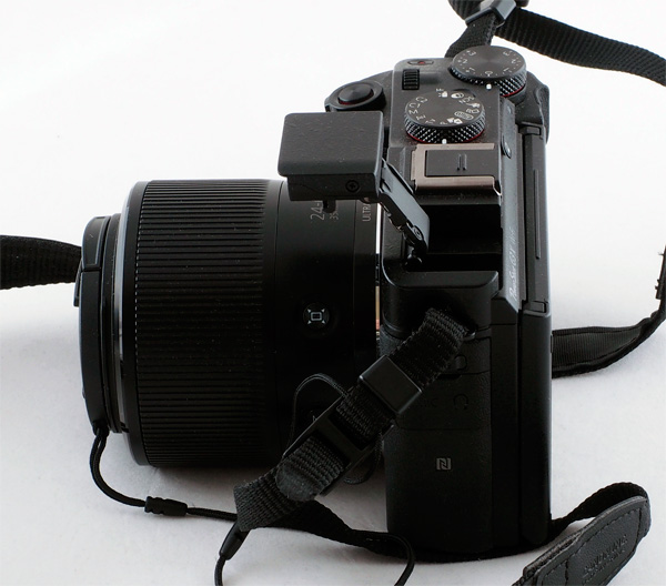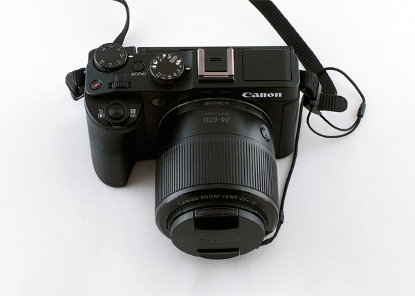 Более или менее традиционное исполнение для серии G. Однако выступ под хват справа заметно удобнее, чем у модели G1 X. Почему на несъемном объективе не сделали шторку, как на G1 X, не знаю, но зато крышку объектива заботливо привязали веревочкой, чтобы не потерялась.