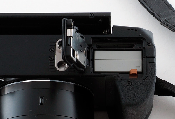 Снизу - крепление под штатив и отсек с аккумулятором и картой памяти.