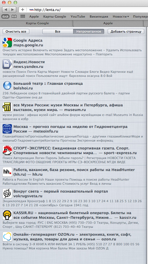В разделе коллекции в удобном режиме предпросмотра (CoverFlow) выводятся всякие сущности: история адресов, панель закладок, адресная книга, источники RSS и так далее.