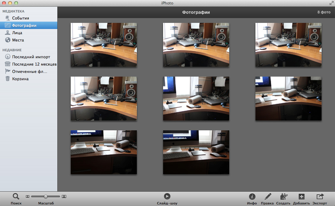Базовая программа просмотра изображений тут более продвинутая, чем в Windows. Правда, я тут не встретил сортировки, например, по размеру файлов, но тут есть другие возможности - вообще говоря, более интересные. iPhoto умеет отбирать фотографии по именам, событиям (папкам), лицам, местам и отмеченные флажком.