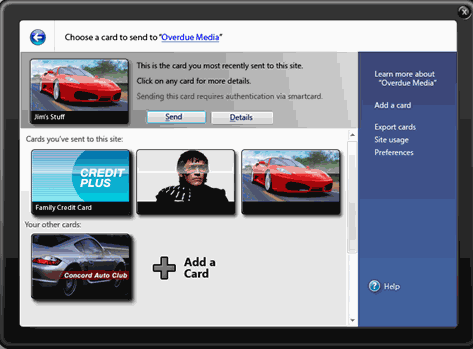 Пользователь нажимает на значок, после чего локальная подсистема CardSpace выводит ему список всех его карточек, среди которых пользователь выбирает нужную. Это окно защищено от любого программного доступа, так что выбрать карточку может только пользователь собственноручно.