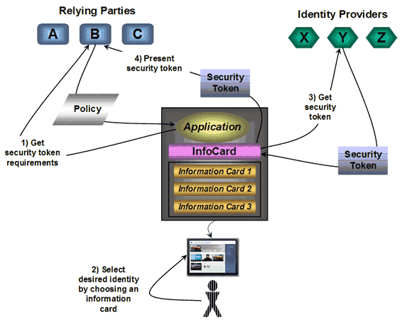 Пользователь выбирает какого-то поставщика удостоверений, заполняет на его сайте соответствующую форму, после чего получает карточку (ее называют Information Card) - подписанный файл, который хранится на его компьютере локально в базе карточек.
