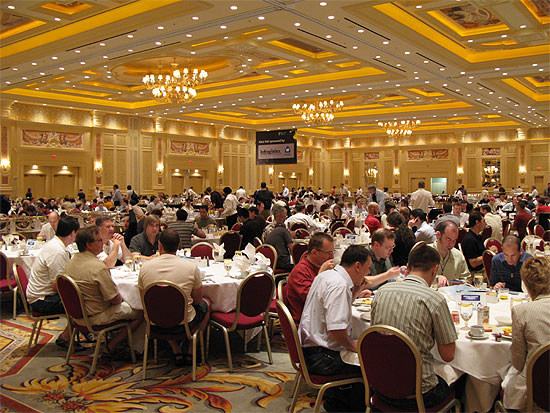 В стоимость участия в конференции входило питание: завтрак и обед. Проходило это мероприятие в зале на пятом этаже, куда с легкостью вмещалось не менее тысячи человек. В программе пребывания завтрак скромно именовался "континентальным" (обычно под этим подразумевается кофе или чай, джем и круассан), однако на деле вместо "континентала" предоставлялся отличный буфет (в европейском варианте это называется шведским столом) и от участников конференции требовалась немаленькая выдержка, чтобы не поддаться соблазну, в противном случае это было чревато сытыми засыпаниями на утренних сессиях.
