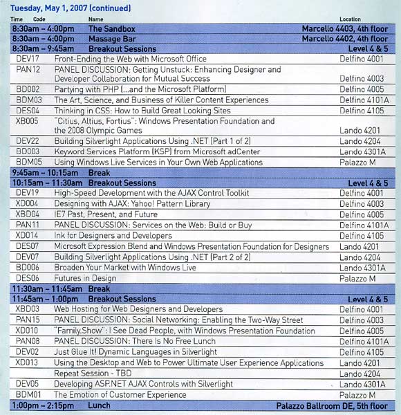 И действительно, на конференции присутствовали, выступали и охотно вели диалог крупные и весьма известные деятели корпорации Microsoft, например: Рэй Оззи - главный софтверный архитектор (Ray Ozzie, Chief Software Architect, Microsoft Corporation), президент отдела развлечений и устройств Роберт Бах (Robert Bach, President, Entertainment and Devices Division, Microsoft Corporation), директор Скотт Гатри (Scott Guthrie, General Manager, Microsoft Corporation), не говоря уж о программном менеджере Стефане Счакоу (Stefan Schakow), архитекторе платформы MSIE Крисе Уилсоне (Chris Wilson, IE Platform Architect) и прочих.