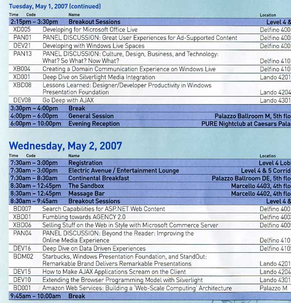 Это так, я это все наблюдал. Пара тысяч собравшихся спецов говорили о чем угодно - о SilverLight, Expression Studio, Vista, WPF, CardSpace, - но только не о том, ради чего народ обычно приезжает в Вегас: азартные игры, выпивка, девочки, всяческие шоу и развлечения. Ну развлекает этих людей SilverLight - ну что тут сделаешь? И ведь они при этом счастливы - уж я знаю, я сам лет пятнадцать был точно такой же standard nerd, причем отлично себя чувствовал в этом качестве.