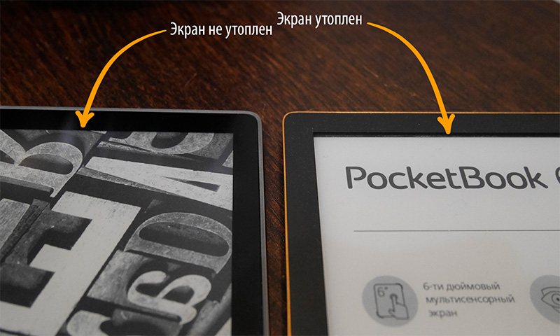 Кроме того, дисплеи всех ридеров PocketBook слегка утоплены во фронтальной панели. Это специально делается для того, чтобы при падении ридера экраном вниз силу удара на себя принимала прежде всего фронтальная панель.