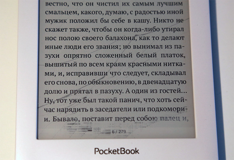 Однако производители - тот же PocketBook - серьезно работают над тем, чтобы увеличить надежность дисплеев своих ридеров. Конечно, ридер - это не защищенное устройство, которое можно швырять с высоты на асфальт и которому от этого ничего не будет, но и от каждого чиха они тоже не разбиваются: в этих ридерах используются специальные металлические пластины, на которые наклеивается экран, и это оберегает всю конструкцию от скручиваний и других нагрузок.