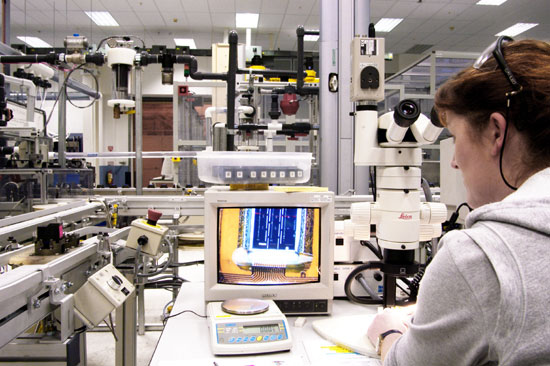 На заводе первым делом нам показали цех, где делают заготовки для самой печатающей головки, монтируемой на картридж. Сопла проделываются на специальных круглых тончайших пластинах с минимальными допусками, и их тщательно контролируют, чтобы не было никаких отклонений. Цех выглядит футуристически - производство в основном автоматическое, так что там только изредка попадаются люди, которые выглядят как космонавты: одеты в белые одежды, на ногах бахилы, на головах шапочки, защитные очки, маски.