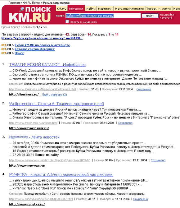 В Рунете мелкая "сенсация": холдинг eHouse завершил первый этап "Кубка Кубков eHouse по поиску" и совершенно неожиданно выяснил, что, оказывается, "Яндекс", с которым eHouse связывают не сильно дружеские отношения, эдак примерно в шесть раз менее эффективен, чем - внимание! - поисковик KM.ru, с которым eHouse уже давно связывает нежная дружба. Да, ребята, вот такая вот сенсация. Я так думаю, что теперь всем нужно дружно забыть о "Яндексе" и пользоваться только КМ.ru. Собственно, я так и хотел сделать - тут же вычеркнуть "Яндекс" из сердца и навеки поселить туда КМ.ru, который, как мы помним, в плане поиска пока отличился только вполне мерзкой кампанией по уничтожению электронных библиотек с целью оставить в Рунете только одну электронную библиотеку - свою собственную, аккуратно ими спертую у тех самых электронных библиотек.