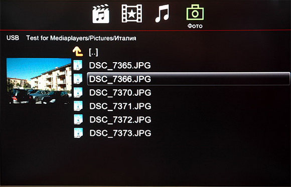 После выбора конкретного носителя выводится список файлов на нем. Сверху идут пиктограммы, помогающие отбирать определенный контент: видео, музыка, изображения.