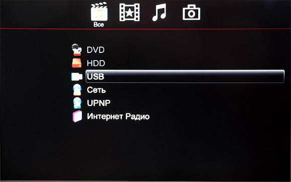 Центральная пиктограмма - просмотр всех медиафайлов. При выборе этой пиктограммы вам выводят все возможные устройства: DVD (если подключено к USB), встроенный диск, USB-устройства, сетевые, UPNP, интернет-радио.