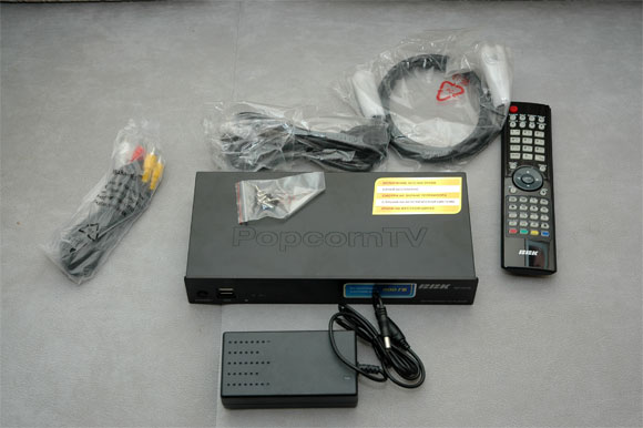 BBK Popcorn TV поставляется в следующей комплектации: само устройство со встроенным жестким диском на 500 гигабайт, ПДУ, блок питания, небольшой HDMI-кабель, композитный audio-video-кабель.