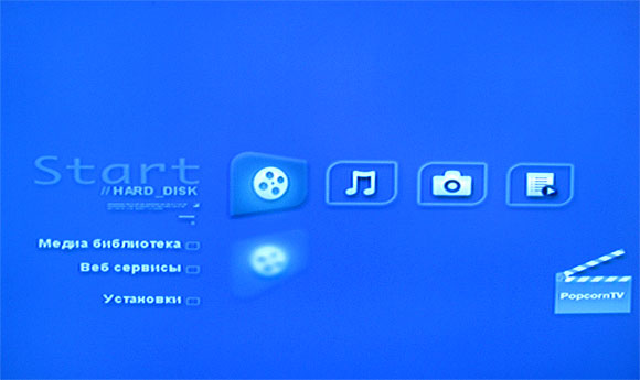 Если выбрать пункт меню "Медиабиблиотека", тогда Popcorn TV выдаст все виды сетевых устройств, откуда можно воспроизводить медиаданные: встроенный жесткий диск, Network Browser, медиабиблиотеки сетевых компьютеров, медиасерверы сетевых накопителей и так далее.