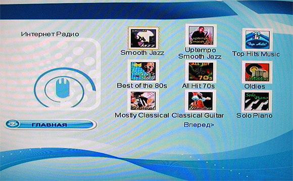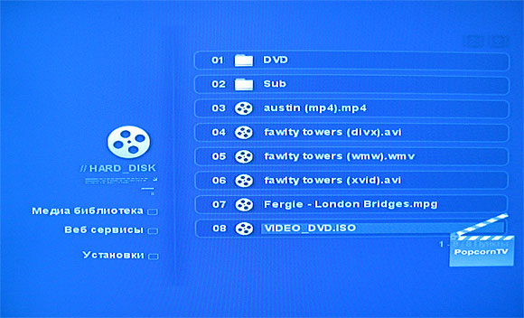Воспроизведение медиаданных с внешних носителей. С этим также все нормально. Достаточно подключить к Popcorn TV внешний жесткий диск (NTFS поддерживается) или флешку - после этого появляется волнующая надпись "Подключена внешняя USB-клавиатура" и в меню возникает соответствующий носитель, содержимое которого можно просмотреть и проиграть точно так же, как и содержимое встроенного диска.