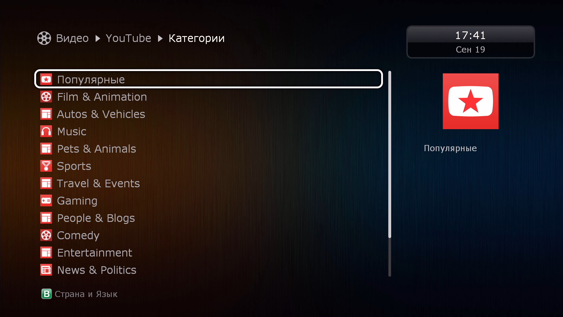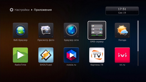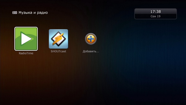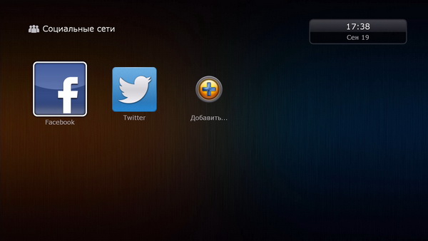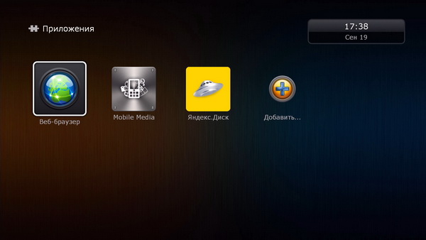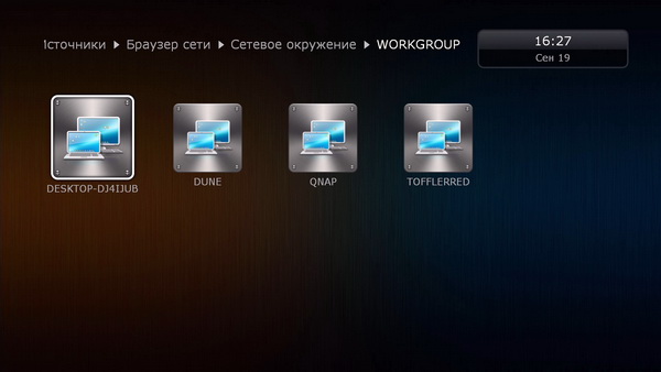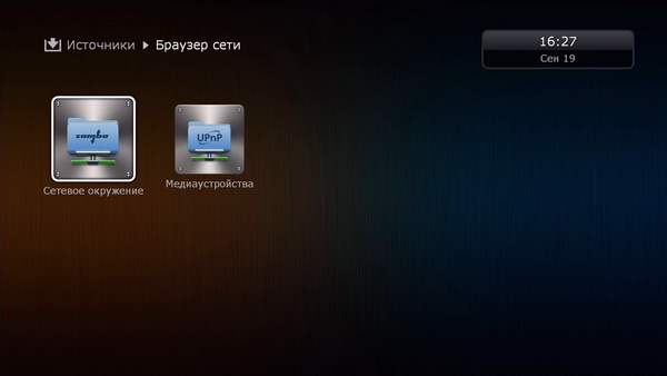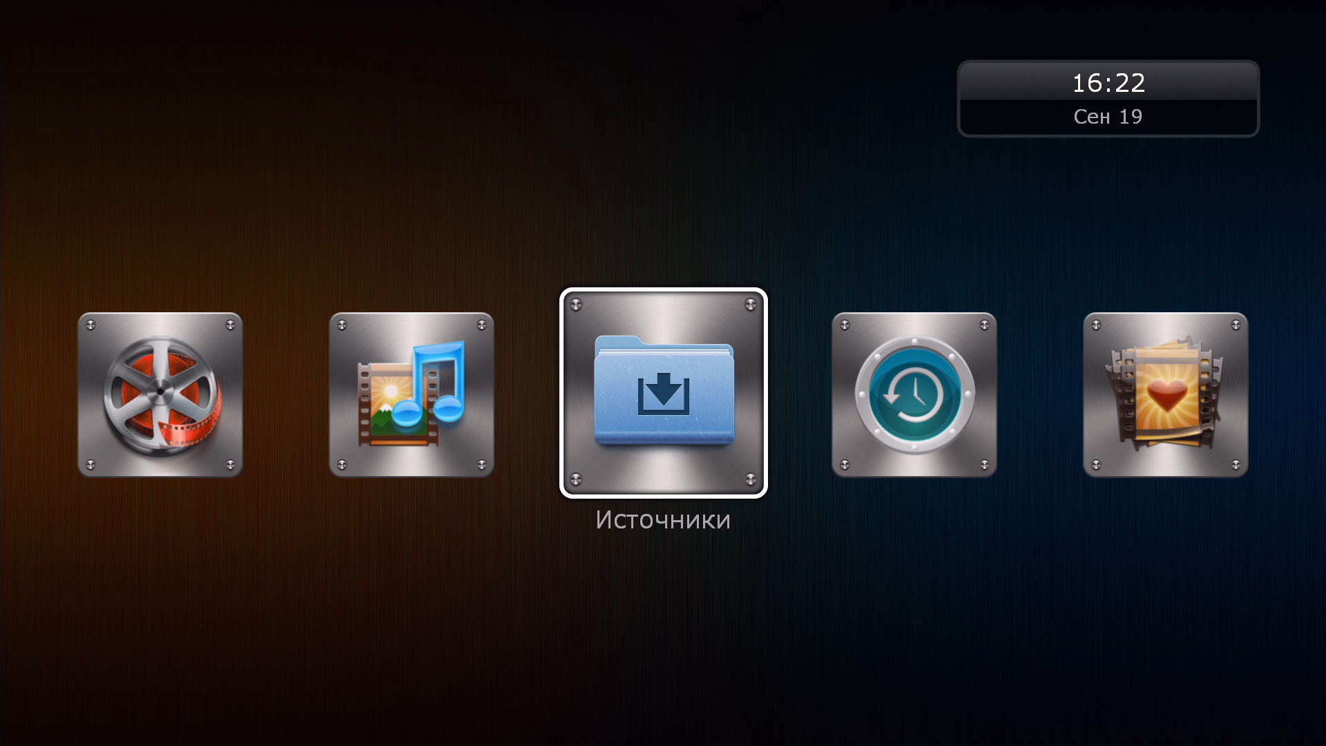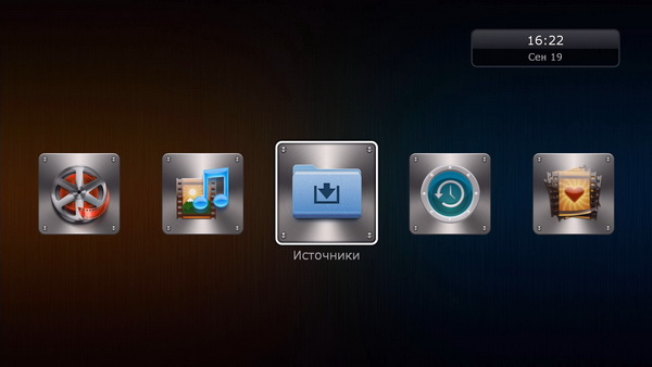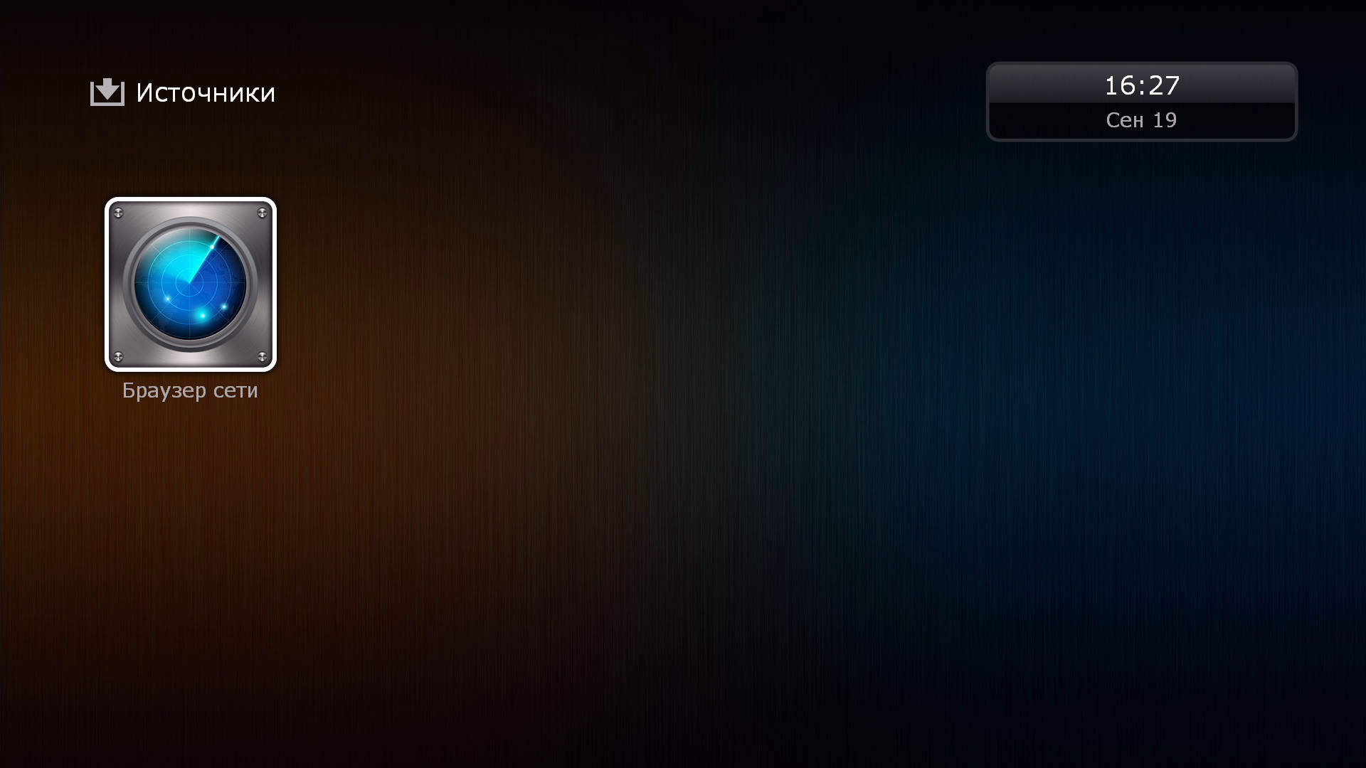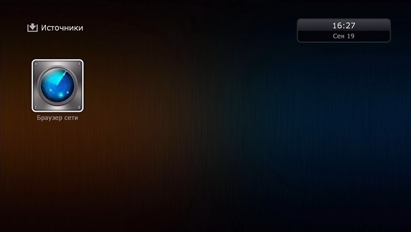 Раздел "Источники". Здесь появляется пиктограмма браузера сети (если сеть подключена), также здесь появляются пиктограммы подключенных через USB устройств (если они подключены).