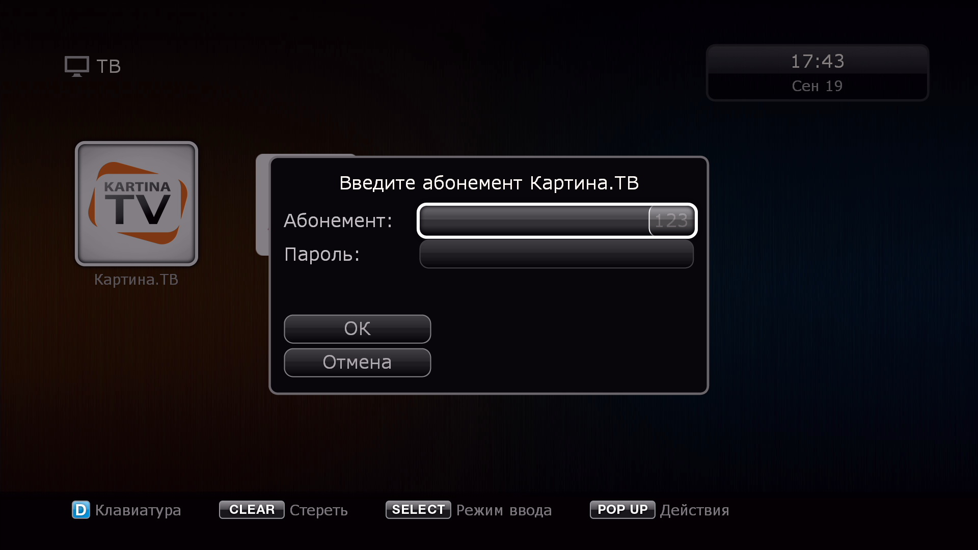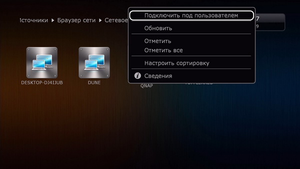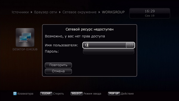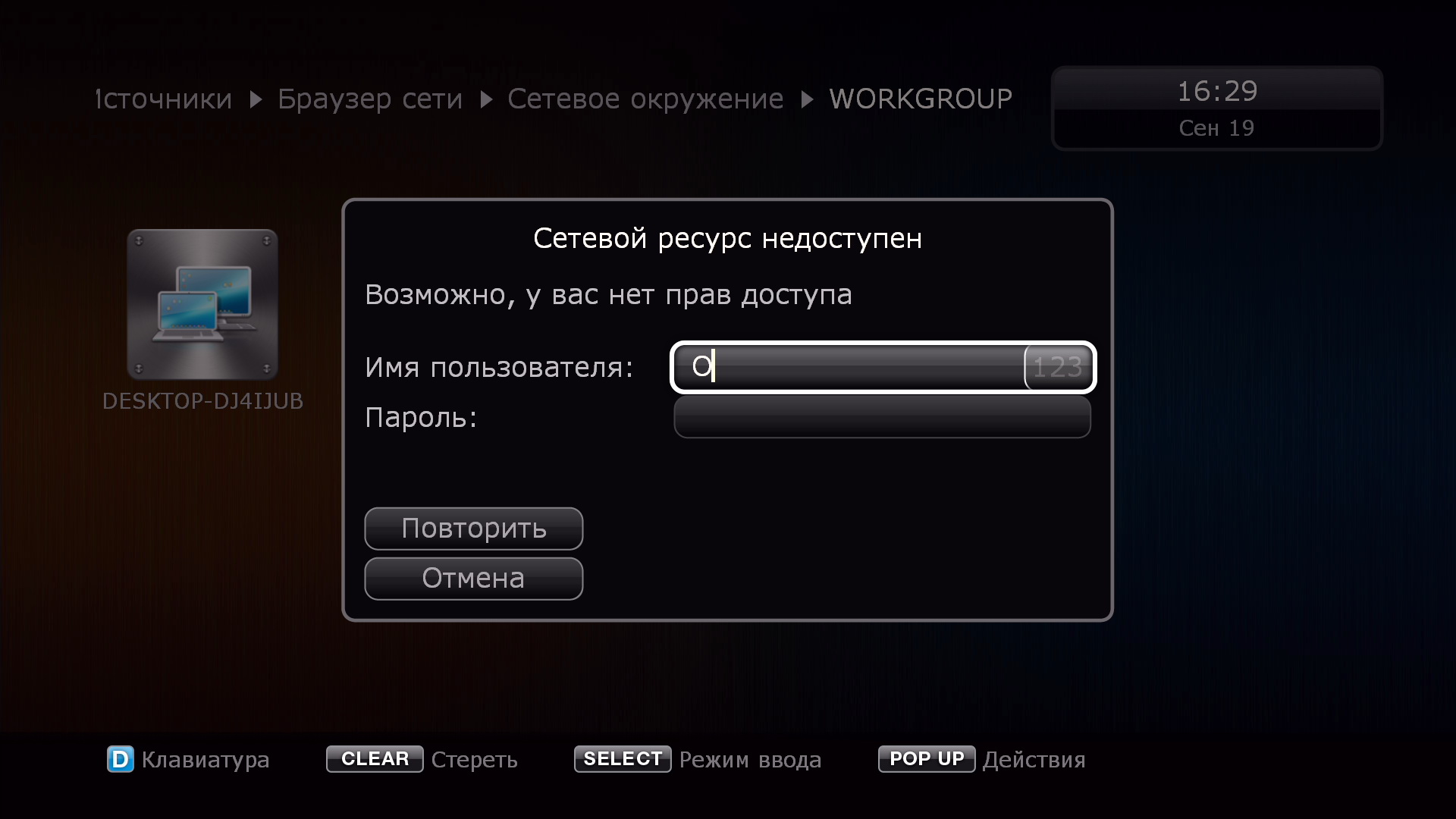 Если доступ в сетевое устройство по логину-паролю, медиаплеер его запрашивает: ввод данных производится с пульта с помощью экранной клавиатуры.