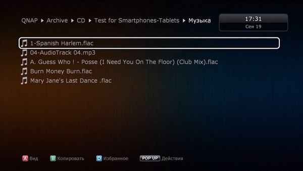 Кнопкой Pop Up вызывается меню: воспроизвести, добавить в избранное, отметить и всякие средства работы с файлом.
