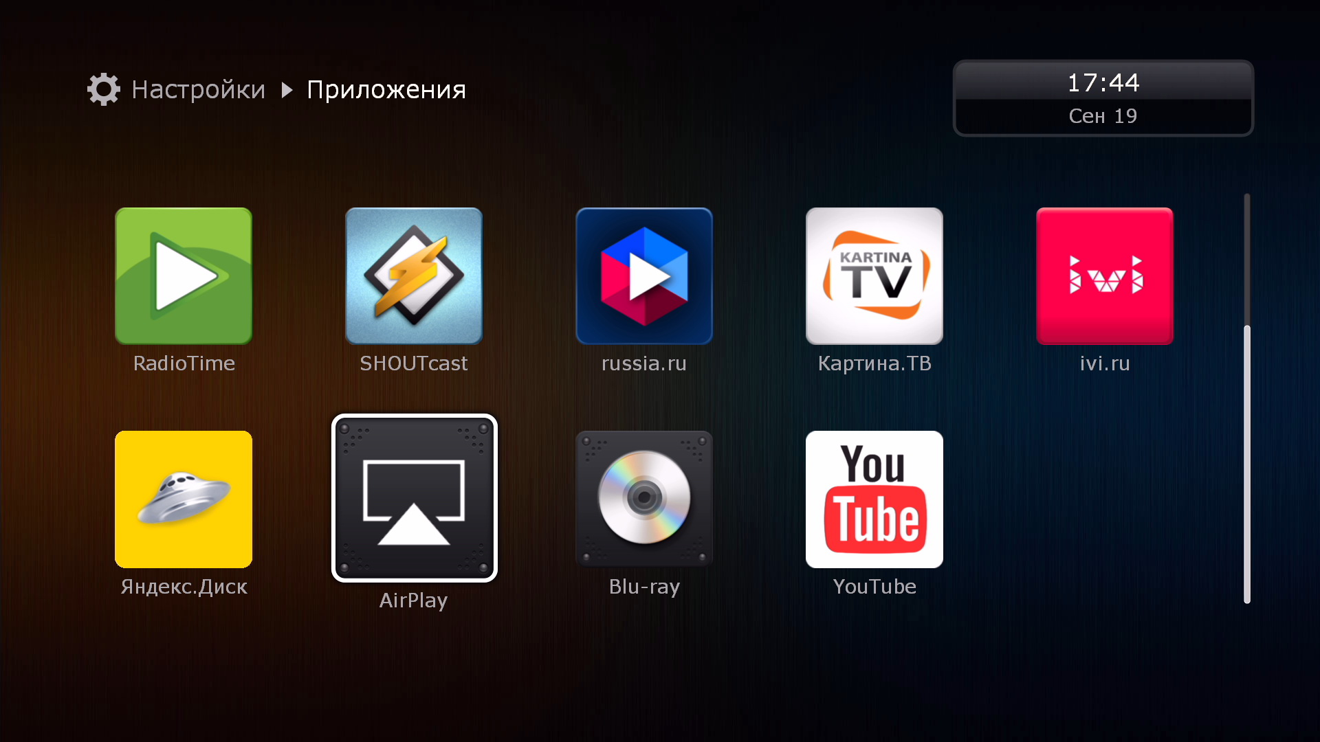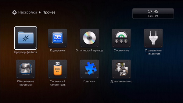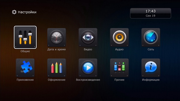 Главное окно медиаплеера реализовано в традиционном для большинства медиаплееров и игровых приставок виде: большие пиктограммы, расположенные горизонтально и прокручиваемые по горизонтали.