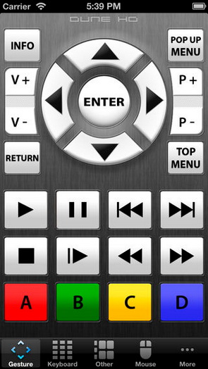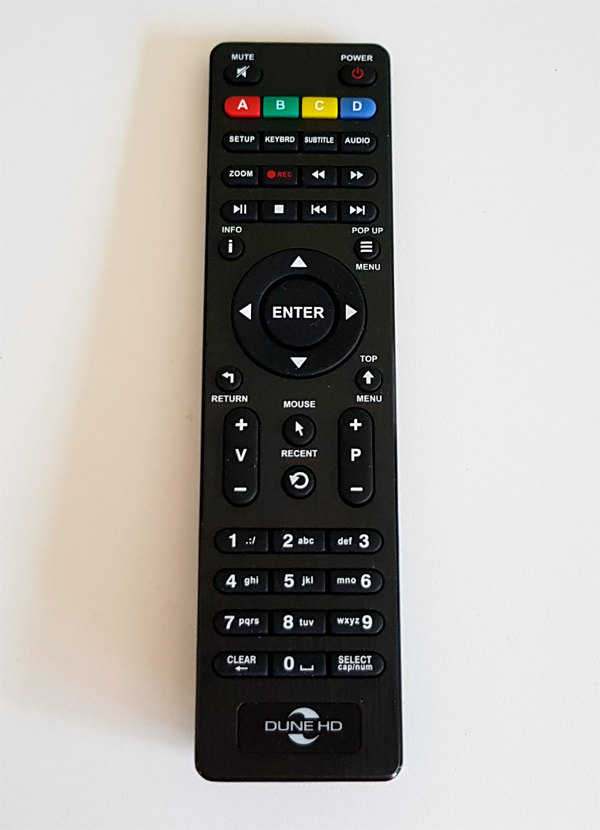 Входящий в комплект пульт - стандартного размера и без всяких дизайнерских изысков (слава богу, а то бывает, знаете ли, пользоваться невозможно). Набор кнопок - обычный как для Dune, так и для большинства других плееров.