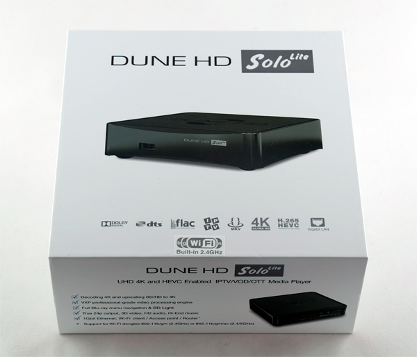 Посмотрел, что там сейчас есть из этой серии, выяснил, что в Испании есть дилер по продаже техники Dune, ну и в результате выбрал себе модельку под названием Dune HD Solo lite. Это младшая версия модели Dune HD Solo, стоит она почти в два раза дешевле (15 990 рублей против 24 990 рублей), а отличается от нее только отсутствием отсека под жесткий диск 2,5" (мне не нужен), отсутствием встроенного ТВ-тюнера DVB-C/T/T2 (у меня давно есть отдельный), и Wi-Fi здесь 2,4 ГГц, а не двухдиапазонный, как у старшей модели (я использую только проводное соединение, так что два диапазона без надобности).