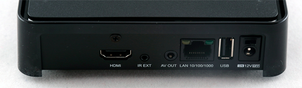 На задней панели: порт HDMI, удлинитель приемника ИК (это если медиаплеер нужно засунуть в какое-нибудь труднодосягаемое место; сам удлинитель покупается на сайте Dune за 500 рублей), AV OUT, гигабитный порт Ethernet, второй порт USB, вход адаптера питания и кнопка включения над ним.
