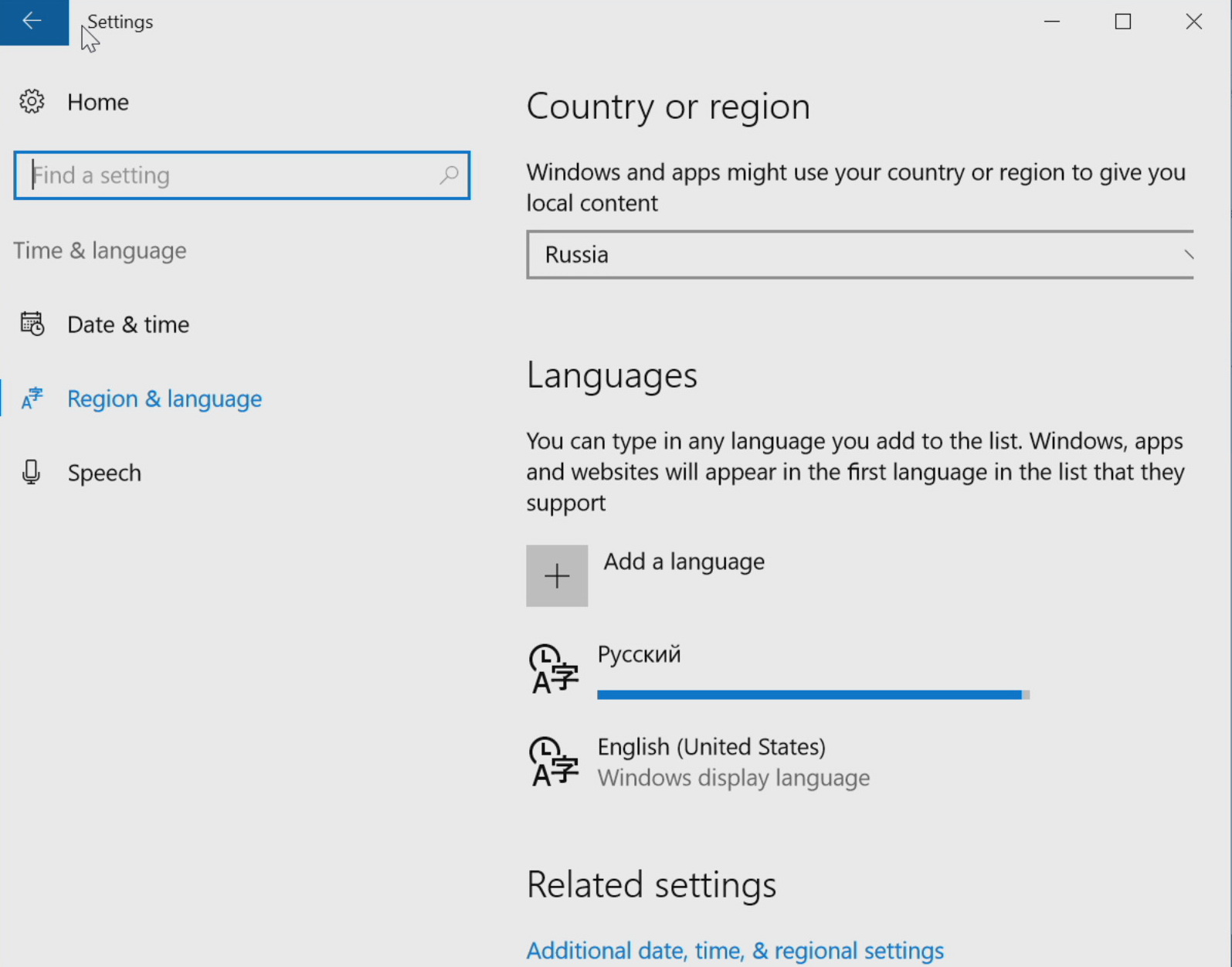 Но его легко переключить на русский: нужно зайти в настройки региона и языка (Region & Language), добавить русский язык в языки интерфейса (компьютер скачает языковый пакет), после чего переключиться на русский.