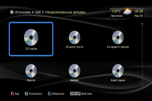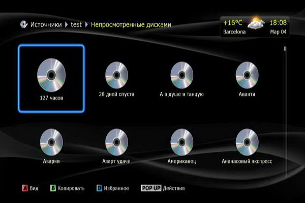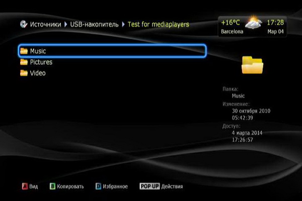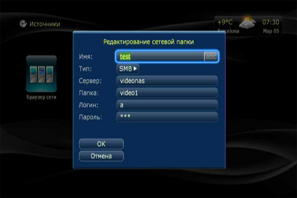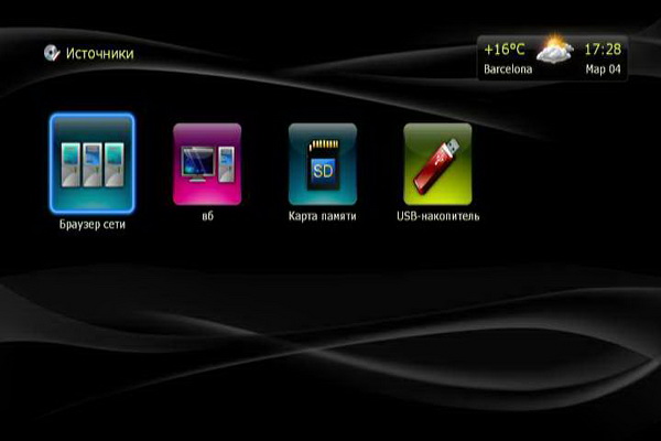 Источниками медиаданных могут быть: сеть (Samba-серверы, то есть компьютеры Windows, и UPnP), сетевые папки (если нужен логин-пароль), карта памяти, накопители, подключенные по USB.