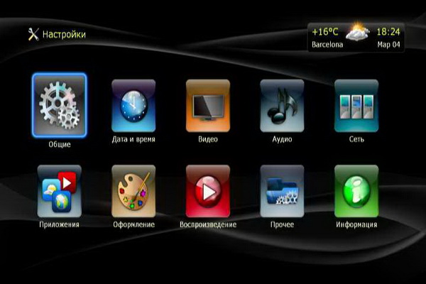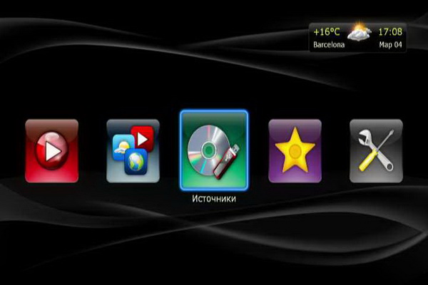 После включения медиаплеер выводит главное меню, представляющее собой крупные пиктограммы.