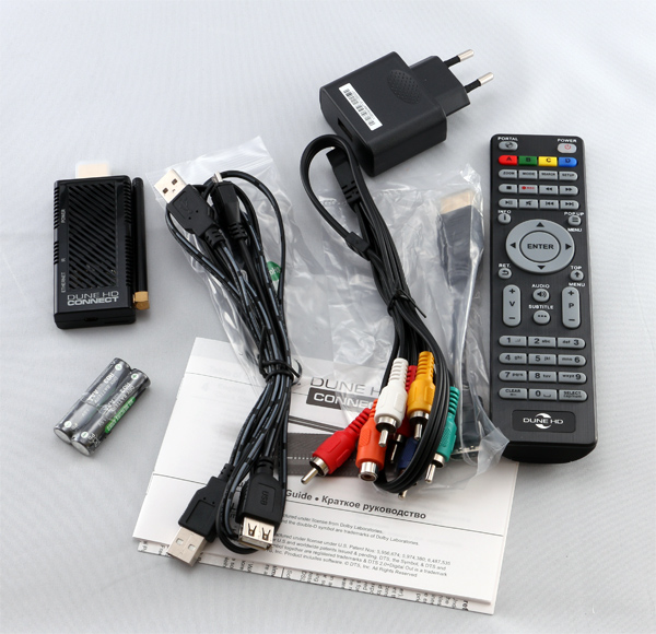 В комплекте: медиаплеер, адаптер питания, кабель USB-microUSB с дополнительными USB-коннекторами, удлинитель HDMI, специальный универсальный кабель для аналогового подключения к аудиовидеотехнике и цифровым аудиовыходом, пульт управления, инструкция, батарейки для пульта, внешний ИК-приемник с проводом.