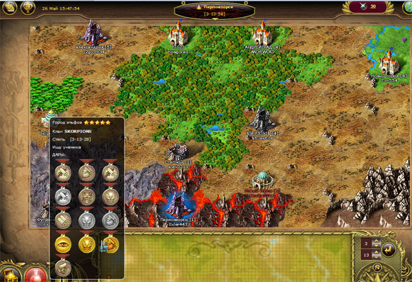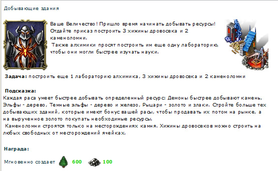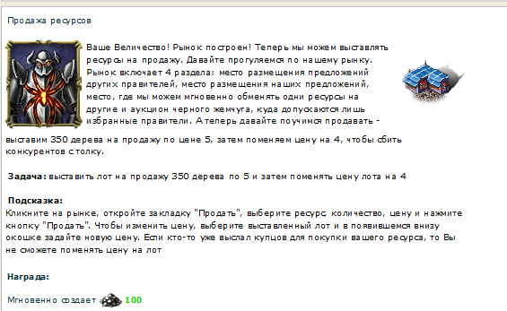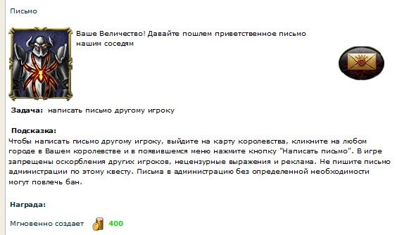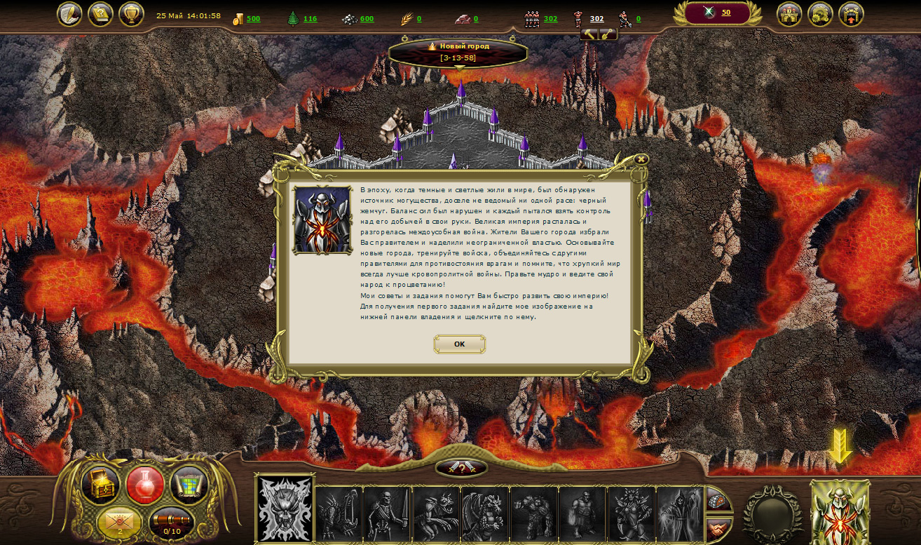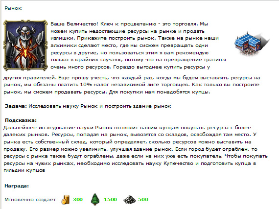 Далее нас знакомят с легендой города. В моем городе когда-то темные и светлые силы жили в мире. Потом они поссорились из-за бабы черного жемчуга, так что началась междоусобица. Жители города избрали меня своим правителем (кстати, большое спасибо за доверие). Они теперь надеются, что я буду основывать новые города, изучать науки (ага, ЩАС), строить и улучшать здания (тоже мне, нашли Собянина), тренировать войска, нанимать героев, торговать на рынке, исследовать местность в поисках заброшенных поселений неизвестной древней цивилизации, побеждать монстров, отнимать у других игроков Внешние Владения (с удовольствием), шпионить за другими игроками (всем срочно встроить жучки в клавиатуру), бороться за прилегающие к городам поселки, разрушать вражеские здания и восстанавливать свои, объединяться с другими правителями для противостояния врагам.