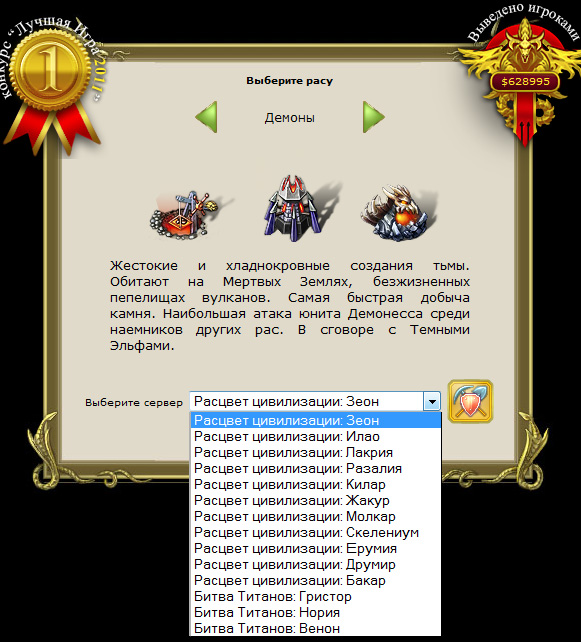 Пришел на сайт, запустил регистрацию. Там, кстати, с самого начала ставят перед серьезнейшим выбором, потому что вы должны определиться, за какую расу в дальнейшем будете сражаться и на каком из миров. Расы предлагаются следующие: светлые эльфы, темные эльфы, демоны и рыцари.
