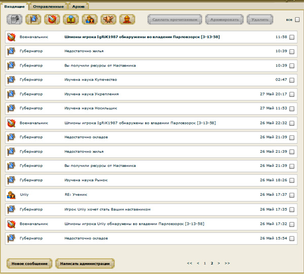 Также туда приходят депеши от Военачальника, который сообщает об обнаружении шпионов и о прочих пакостях. Впрочем, я пока не веду активных военных действий, но как только подкоплю ресурсов, обязательно пойду захватывать ближайшие города - мой город исповедует тактику активного наступления.