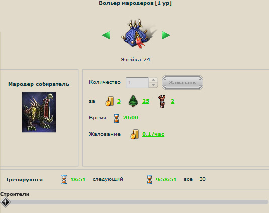 Всякие боевые персонажи выращиваются в соответствующих тренировочных зданиях. Но, прежде чем построить здание, надо изучить соответствующую военную науку. Например, чтобы вырастить мародеров-поглотителей (гордость моего гарнизона), нужно изучить науку "Носильщики" и построить вольер мародеров, где они и будут продуцироваться.