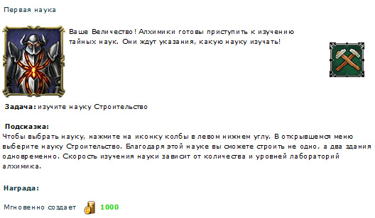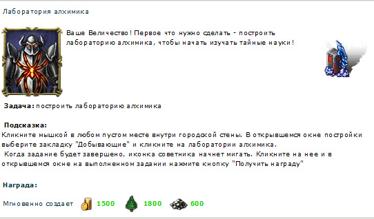Щелкнул, получил задание построить лабораторию алхимика. В принципе это логично - куда вообще без алхимика-то деваться?