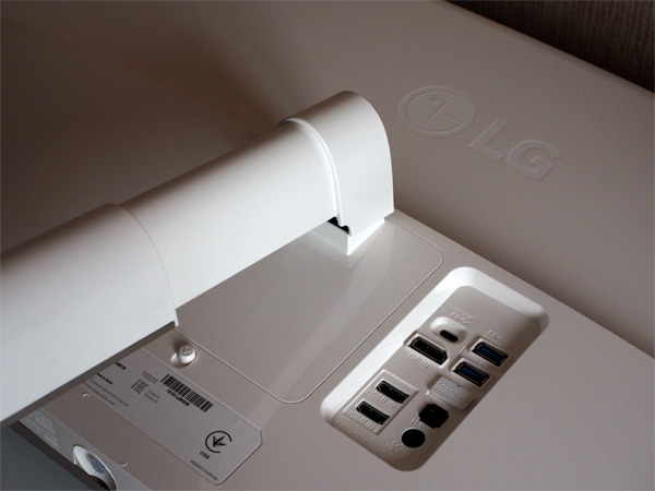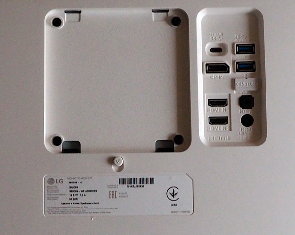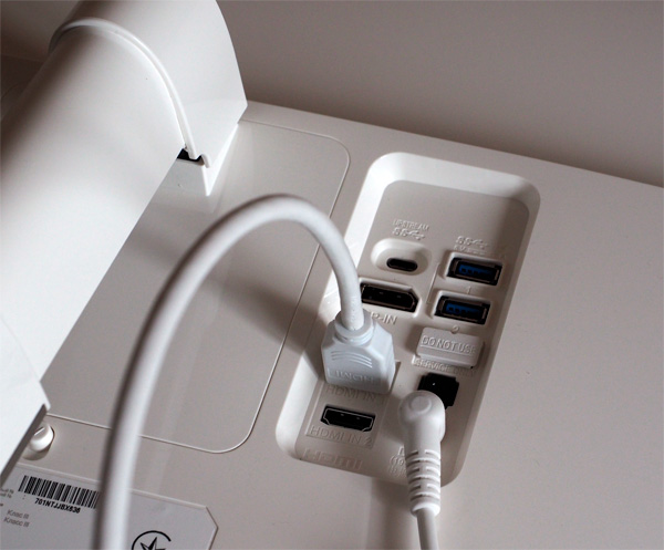 Учитывая тот факт, что колодка с портами расположена почти в самом центре задней крышки, а монитор на подставке не поворачивается - к портам не так уж просто будет подключать различные устройства, поэтому лучше один раз подключить адаптер питания, HDMI или Display Port, а также удлинители портов USB и Type-C, ну и больше туда не лазить. Тем более что с помощью специального пластикового держателя эти провода и удлинители можно кучно закрепить на стойке подставки.