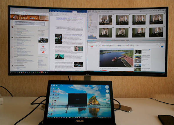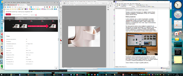 На таком дисплее можно очень комфортно разместить по горизонтали три-четыре приложения, что, например, лично мне по работе часто бывает нужно. (Например, когда пишешь статью и работаешь с различными источниками информации, также при этом одновременно готовишь иллюстрации к статье.)