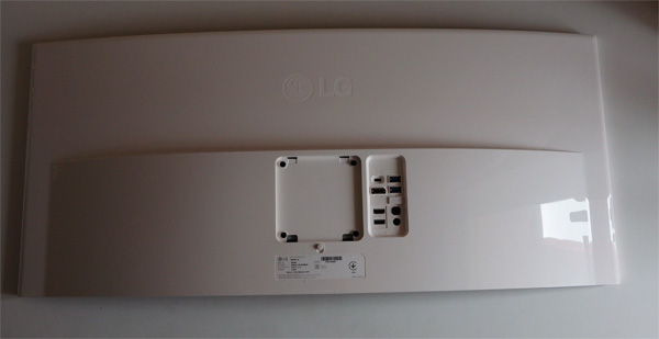 Задняя часть монитора. Видна посадочная площадка под подставку, причем там расположены четыре отверстия по стандарту VESA 100 × 100 мм с вкрученными винтами, рядом расположен блок портов.