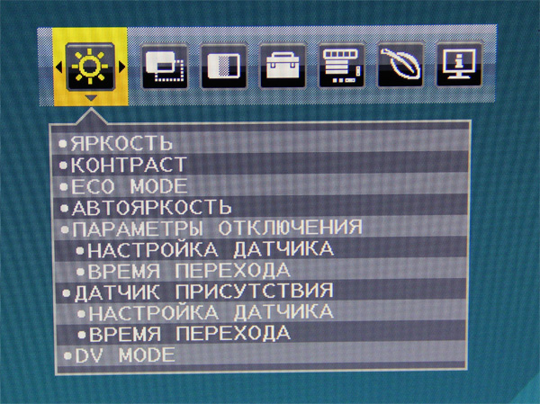 Различные настройки яркости, контраста, включение ECO-режима, задание параметров автоматической настройки, автоматического отключения, работы датчика присутствия.