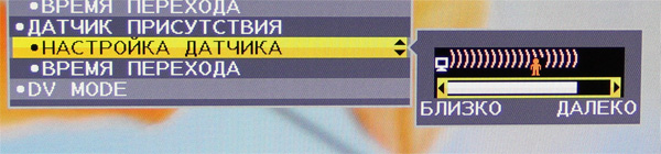 В экранном меню выставляется диапазон расстояния, на котором должен находиться человек перед монитором, чтобы экран не выключался. Время перехода - это время задержки срабатывания (у меня поставлено 2 минуты). Стоит отойти от монитора - через выставленное время задержки монитор выключается. Как только возвращаетесь - в течение секунды он включается. Очень удобно!