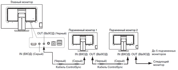 Специальная функция синхронизации настроек главного монитора с остальными аналогичными мониторами, поддерживающими эту функцию. Работает это все вот по такой схеме: от главного монитора с помощью прилагаемого кабеля идет сопряжение с подчиненными мониторами, и на них можно апдейтить настройки, сделанные на основном мониторе. При этом следует иметь в виду, что датчик освещенности и датчик обнаружения присутствия будут работать только на главном мониторе.