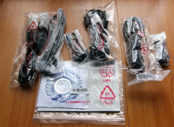 Комплектация - монитор, брошюра, диск с документацией и целый набор проводов: кабель питания, кабель Control Sync, USB-кабель, аудиокабель, VGA- и DVI-кабели.