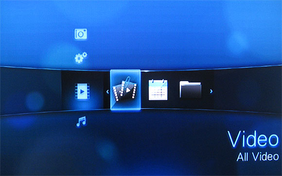 Экранное меню у WD TV вполне традиционное: пиктограммы "Фото", "Музыка", "Видео" и "Настройки". А вот подменю у пиктограмм уже достаточно оригинальные. Первый пункт - все треки нужного типа по алфавиту. Для этого сканирование и делается - устройство собирает данные о всех именах файлов в папках, их типах и признаках. Второй пункт - даты. Фотографии и видеоролики раскладываются по "папкам" с датами создания. Третий пункт - физические папки. То есть устройство просто покажет структуру папок выбранного накопителя (напоминаю, что у него два USB-порта, куда одновременно могут быть подключены два накопителя) и выведет там медиафайлы, соответствующие пиктограмме. (Собственно, пиктограмма, как обычно, задает просто фильтр типов файлов - изображения, музыка, видео.) Во всех режимах просмотра списков есть поиск - строка при этом вводится с экранной клавиатуры.