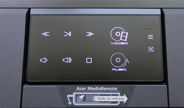 Если нажать на почти незаметную кнопку, располагающуюся в правом верхнем углу тачпеда, то на нем загорятся пиктограммы, с помощью которых можно управлять воспроизведением мультимедиа.
