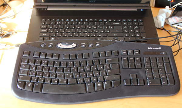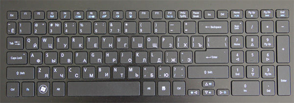 Клавиатура здесь просто отличная - впрочем, мне клавиатуры ноутбуков Acer всегда нравились. Клавиши - отдельно стоящие, с упругим внятным ходом. Места много, поэтому сюда даже уместили Numpad.