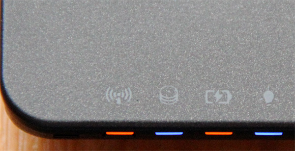Индикаторы - слева на переднем торце: беспроводные сети, жесткий диск, зарядка батареи, индикатор питания.