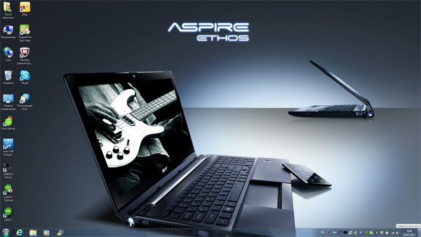 Вот так выглядит десктоп загруженного ноутбука - с заводскими установками и программами.