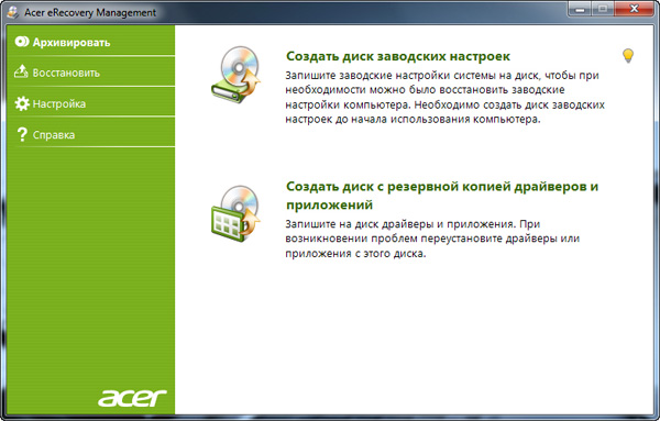 Acer eRecoveryManager - вот эта утилита очень и очень полезная. Создает диски для полной установки системы, также можно сделать резервную копию драйверов и приложений. У меня отработала на ура, когда я переносил систему на SSD.